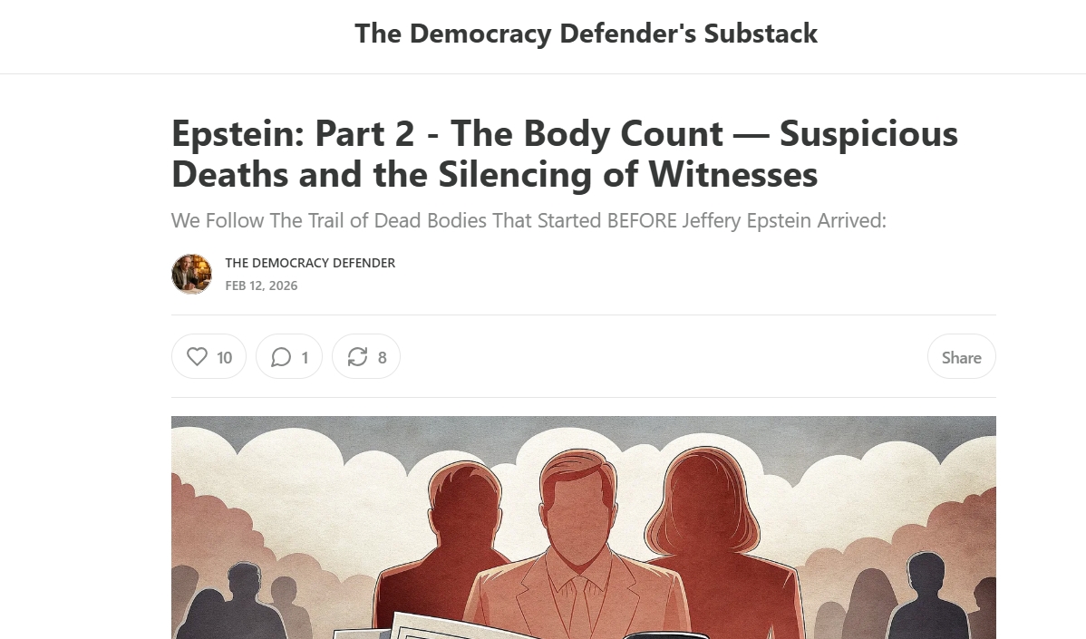 - Le traitement médiatique et politique donne le sentiment qu'une partie du système est sacrifiée pour préserver l'ensemble. Des figures déjà fragilisées deviennent des fusibles, pendant que l'architecture demeure intacte. Parallèlement, le nombre anormalement élevé de morts suspectes crée un climat de brouillard permanent. Chaque disparition referme une porte potentielle sur des informations décisives.