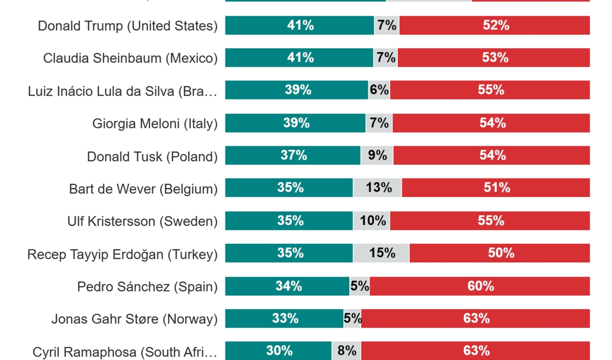 Force est de constater le bon classement de dirigeants constamment vilipendés par une majorité de médias français, quand ils ne sont pas directement traités de fascistes (Javier Milei, Donald Trump, Giorgia Meloni). On ne peut cependant pas simplifier au point d'établir un lien entre popularité et couleur politique : Anthony Albanese (gauche), en Australie, ou Mark Carney (centre gauche), au Canada, sont dans le haut du tableau. Le plus surprenant reste l'écart abyssal qui sépare le dernier de l'avant-dernier. Emmanuel Macron se trouve 10 points en dessous de Petr Fiala (République tchèque). Rappelons que la marge d'erreur oscille autour de 3 points. On pourrait toujours opposer que le président français arrive en fin de mandat et ne bénéficie plus de l'effet fraîcheur ayant séduit de nombreux électeurs en 2017. Mais Donald Trump, lui aussi, en est à son second mandat…
