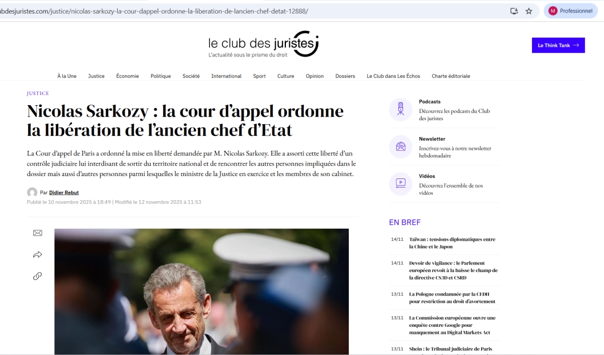 Pour la Cour d'appel de Paris, la détention provisoire en attente de l'appel n'est donc pas justifiée. « Pourquoi, alors, l'était-elle il y a trois semaines ? » s'interroge Vincent Trémolet de Villers (Le Figaro, 10/11/2025). La Cour d'appel désavouerait-elle « l'exécution provisoire » ordonnée par le Tribunal correctionnel ? Nombre de juristes affirment que le Tribunal et la Cour ont respecté le droit à la lettre... mais estiment que la contradiction entre le jugement en première instance et l'arrêt en attente de l'appel exige une révision de la loi (cf. l'article du Club des juristes en lien ci-dessous). La balle est donc renvoyée aux députés qui avaient fait assaut de rigueur en introduisant dans la loi « l'exécution provisoire », sans trop se soucier de sa compatibilité avec la présomption d'innocence.