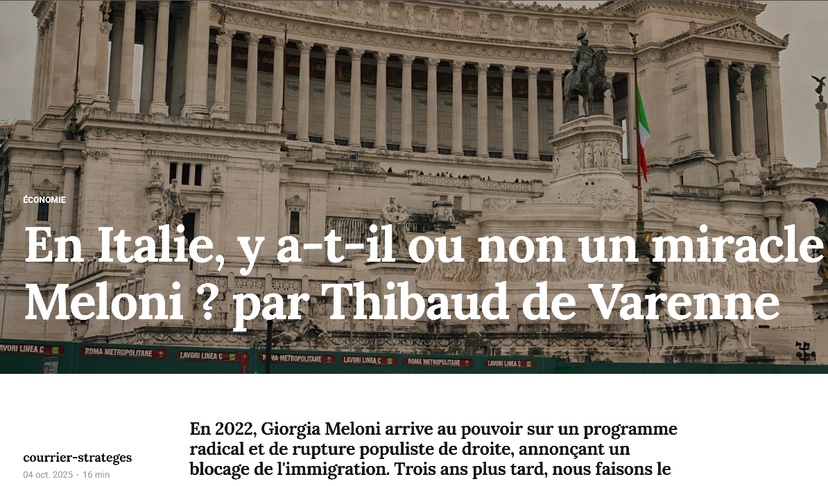 - Giorgia Meloni signe le redressement macroéconomique le plus net depuis 10 ans. Fitch saluant une rigueur budgétaire et une stabilité politique assez inédite en Italie.