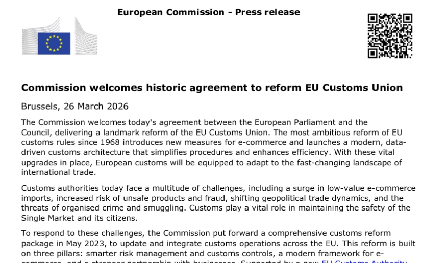 Le document en sélection est un communiqué de presse de la Commission européenne, intitulé « Commission welcomes historic agreement to reform EU Customs Union. » Il s'inscrit dans une salve de documents officiels publiés à cette occasion, dans lesquels la Commission se félicite d'un accord qualifié « d'historique » visant à réformer en profondeur la politique douanière européenne. Historique et pourtant invisible, absent du débat public, à peine relayé. De quoi relativiser le terme ? Non.