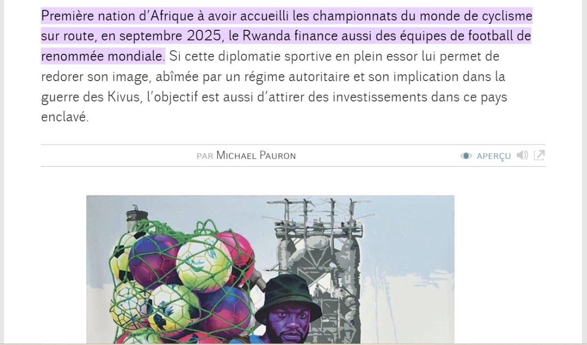 « Visit Rwanda »… Aujourd'hui, le slogan est floqué sur les maillots du PSG, sur les manches des joueurs d'Arsenal, et sur les équipements de l'Atlético de Madrid. Il apparaît depuis fin septembre en NBA (la principale compétition de basketball mondiale), porté par Los Angeles Clippers et en National Football League par les bonnes grâces des L. A. Rams. Cela représente des millions d'euros par franchise, mais offre au Rwanda une vitrine trop efficace pour être négligée. Il y a de quoi s'indigner à la vue d'un État qui dépouille impunément son voisin pour être adoubé d'une telle visibilité. Sauf à considérer qu'il ne s'agit de rien d'inhabituel, surtout dans le monde du sport… « L'argent n'a pas d'odeur », disait Vespasien.