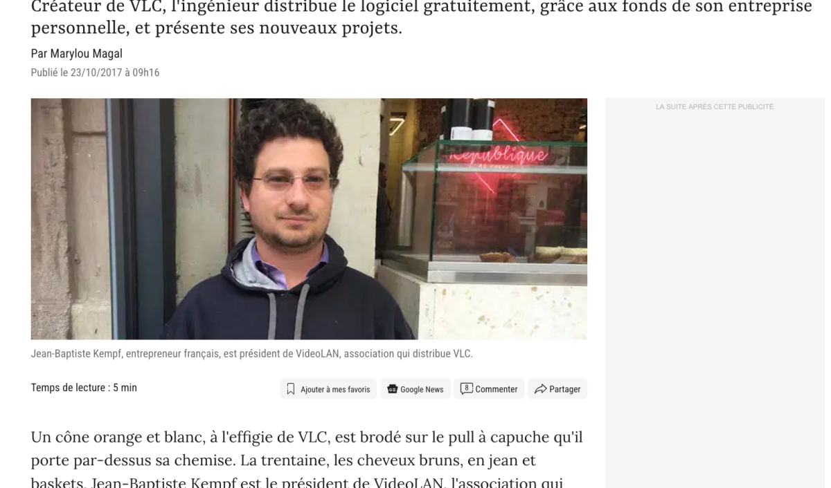 On estime qu'il a été utilisé par plus de six milliards de personnes à travers le monde. Mais derrière VLC, pionnier du streaming vidéo, ce petit logiciel bien pratique pour lire facilement une vidéo sur n'importe quelle machine, se cache une association, et l'ingénieur français Jean-Baptiste Kempf, qui a refusé de devenir millionnaire, juste par respect des utilisateurs. Une démarche rare à l'heure des start-ups et des fortunes express…